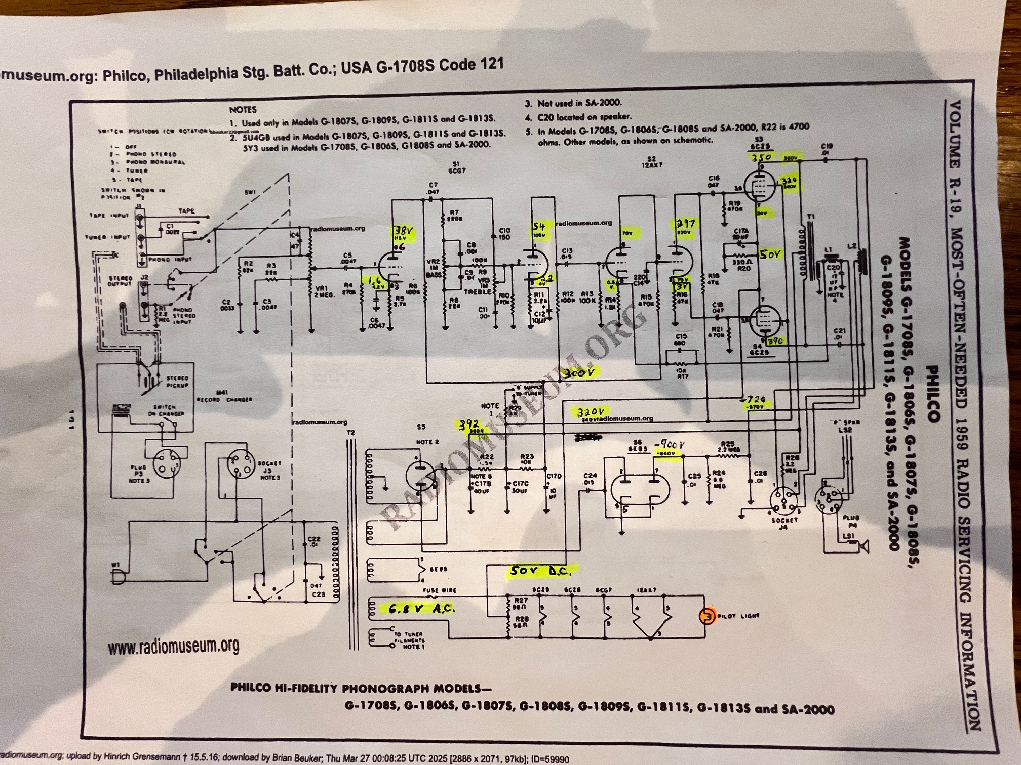 Forum ParticipantI’m a newbie to troubleshooting and repairing vacuum tube electronics, so am needing some help. I’m hoping to get this 1959 Philco 1708 console record player working. The amp currently is not working on it. I started by replacing all the caps in the amplifier that were paper or electrolytic caps. There is one 4-in-one can capacitor however that I haven’t replaced yet as I haven’t sourced it yet. I’ve tested all the tubes with a tube tester and had to replace one of the 6CZ5 tubes. I noticed the two 6CZ5 tubes are red plating, so I’ve limited my troubleshooting to brief “on” periods. I’ve attached a schematic with voltages that I’ve measured(written in pen) as compared to what they should be(typed). It appears as though pins 7 on the 6CZ5 tube, what I think is the grid bias, is about double what it should be. I’m not sure how I go forward from here to try and fix that, as I don’t know the vacuum tubes at all. I’ve attached a link to schematics and parts lists if needed. Would appreciate any help you can provide. Thanks.
