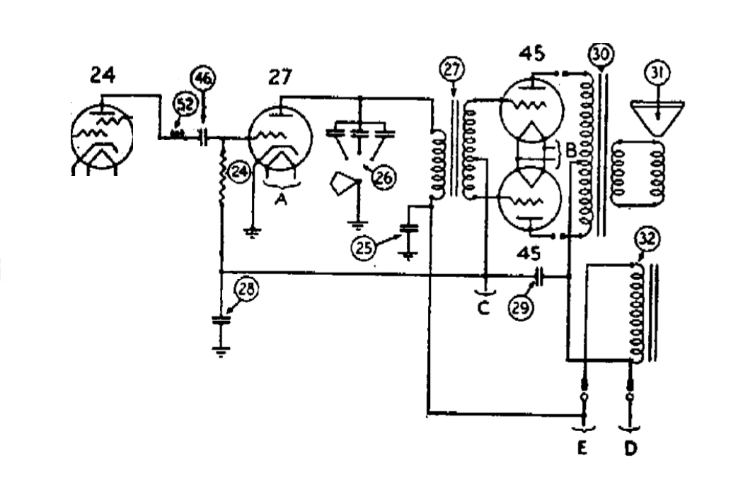 2: There is no negative bias applied to the grids of the 45’s. This would have come from point “C” in the original circuit and is a result of the resistor in the ground/common connection of the power transformer being routed thru a resistor. The voltage is probably around 40 volts or so. There also does not appear to be any bias for the 27 tube as well.