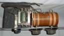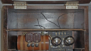 This radio took some time and work to get into condition to show. As found all finish was gone, the base and lid warped, the sides were warped and cracked and a crack in the faceplate. The biggest problem was that some type of oil, probably motor oil, had been spilled on the radio and has soaked into the lid, sides and base. It took many applications over several months of a slurry of diatomaceous earth and naptha to draw the oil out of the wood. With that done the cracks and warping were repaired and the case refinished.