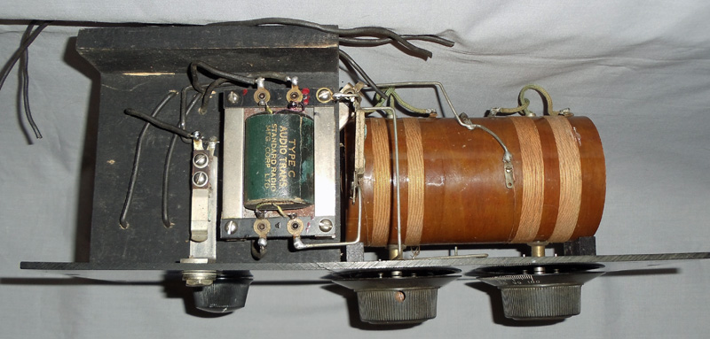 The first stage of the radio was sucessfully tested with an 01A tube and a local station. The second stage was confusing until I realized that its tube socket had been rotated by 90 degrees connecting the A+ to the plate etc. with the buss wiring left in place. With this corrected, the audio transformer reconnected and a second 01A installed the local station could be received well although tuning is very touchy.