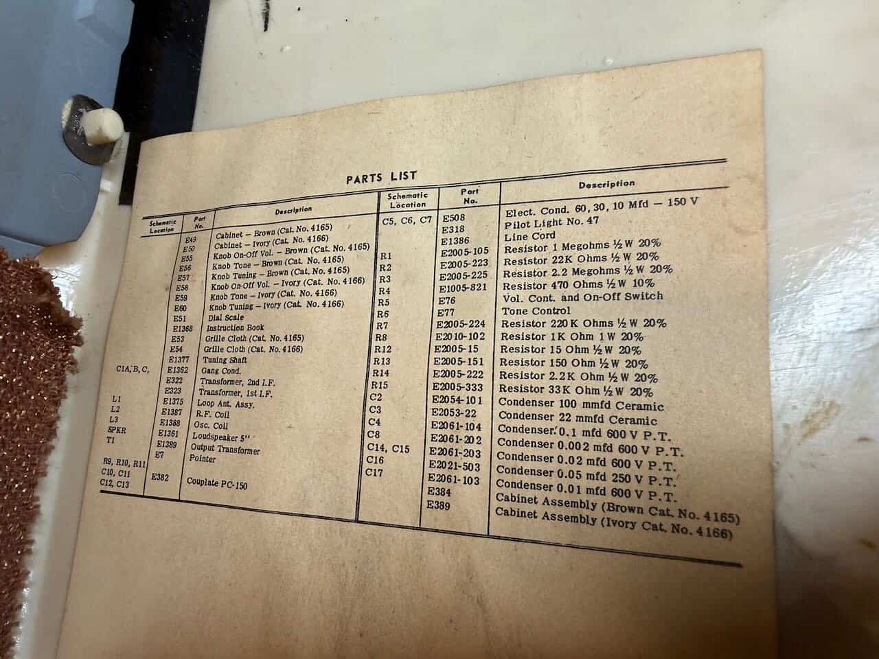 I have about 1/3 of the schematic and parts list as it was mounted to the inner top of the cabinet. Anyone that has this model may have one intact, it would be appreciated if you could send pictures of it. Searching the internet I could not find a schematic from the usual sources Radio Museum etc. I don’t have access to RCC schematics etc. so not sure if it is in there. It appears mostly original but without a schematic I can’t be sure.