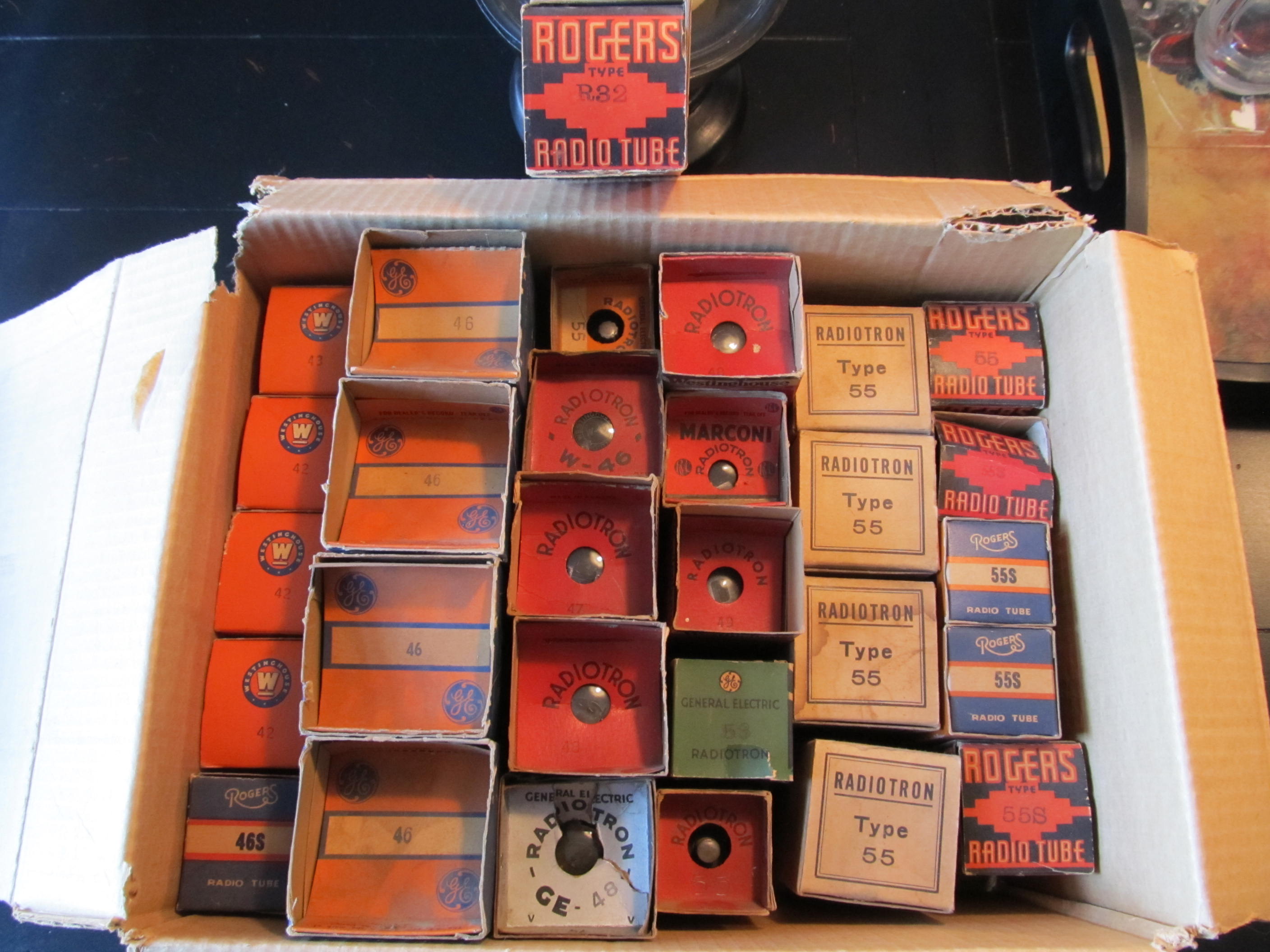 Picked up these tubes locally today. I’m especially happy with the NOS Rogers tubes. Hard to believe an R32 still exists in a box. The 46 tubes on the left side are all of the globe type. I didn’t think I’d find tubes like this anymore.